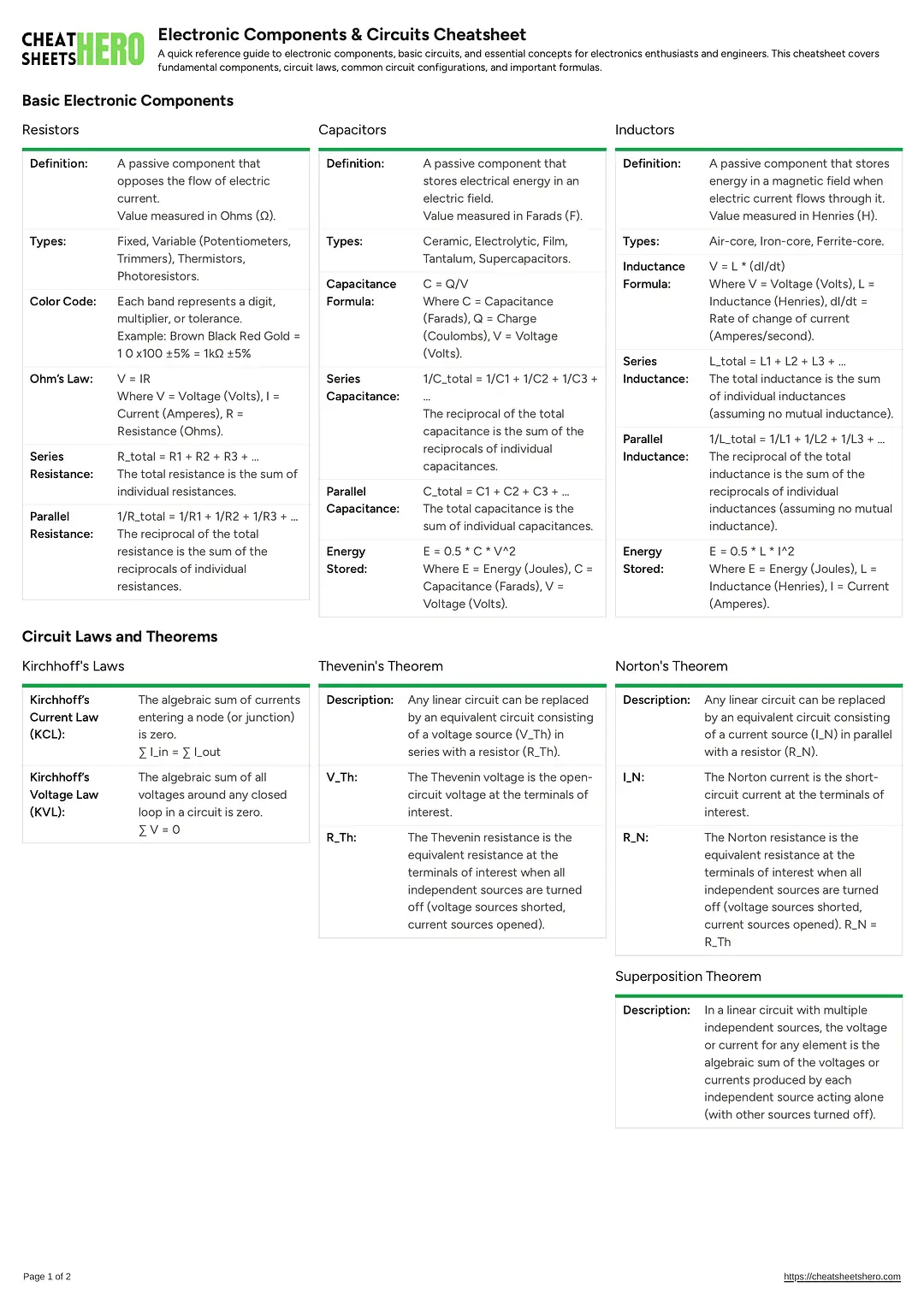 A quick reference guide to electronic components, basic circuits, and essential concepts for electronics enthusiasts and engineers. This cheatsheet covers fundamental components, circuit laws, common circuit configurations, and important formulas.