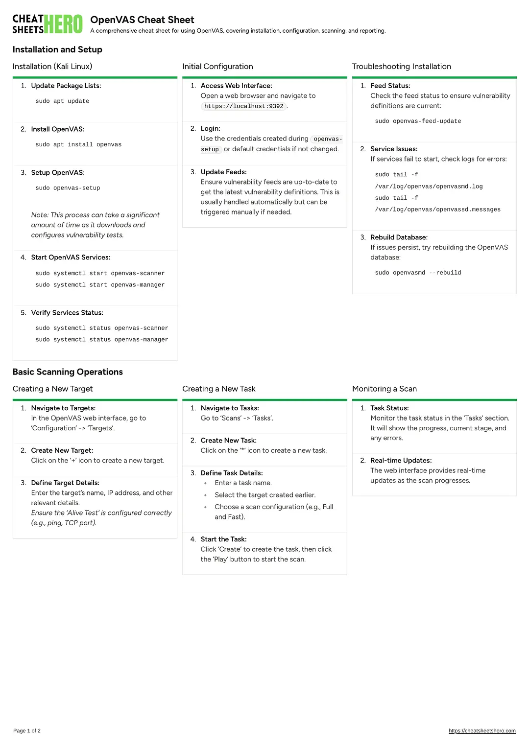 A comprehensive cheat sheet for using OpenVAS, covering installation, configuration, scanning, and reporting.