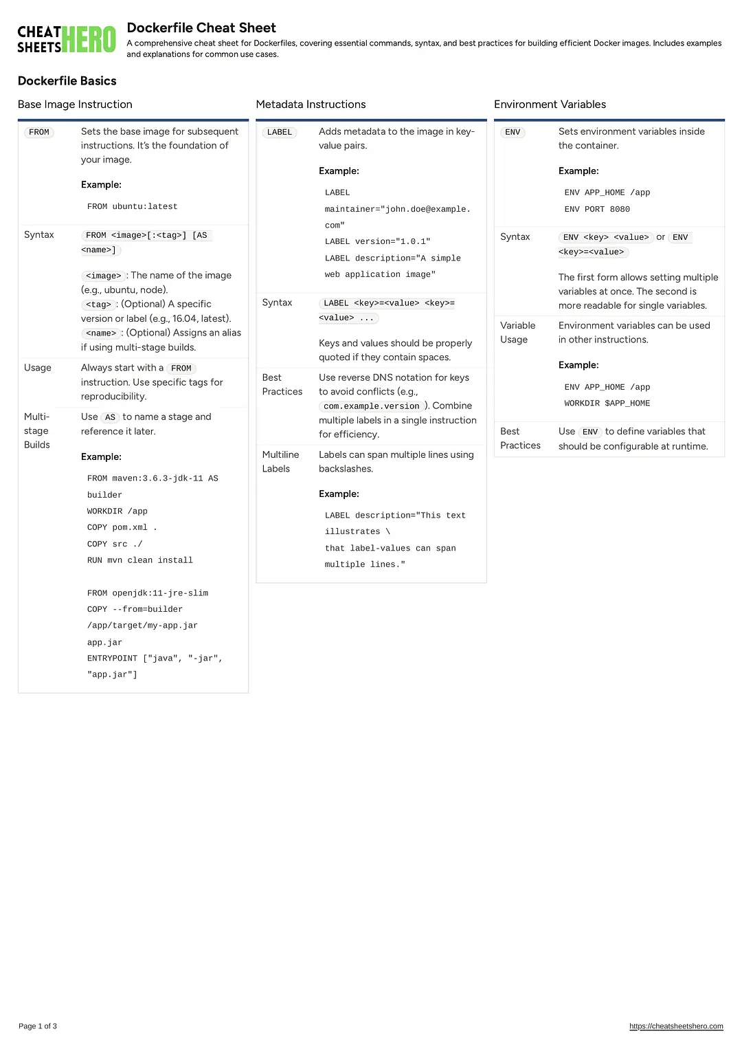 A comprehensive cheat sheet for Dockerfiles, covering essential commands, syntax, and best practices for building efficient Docker images. Includes examples and explanations for common use cases.