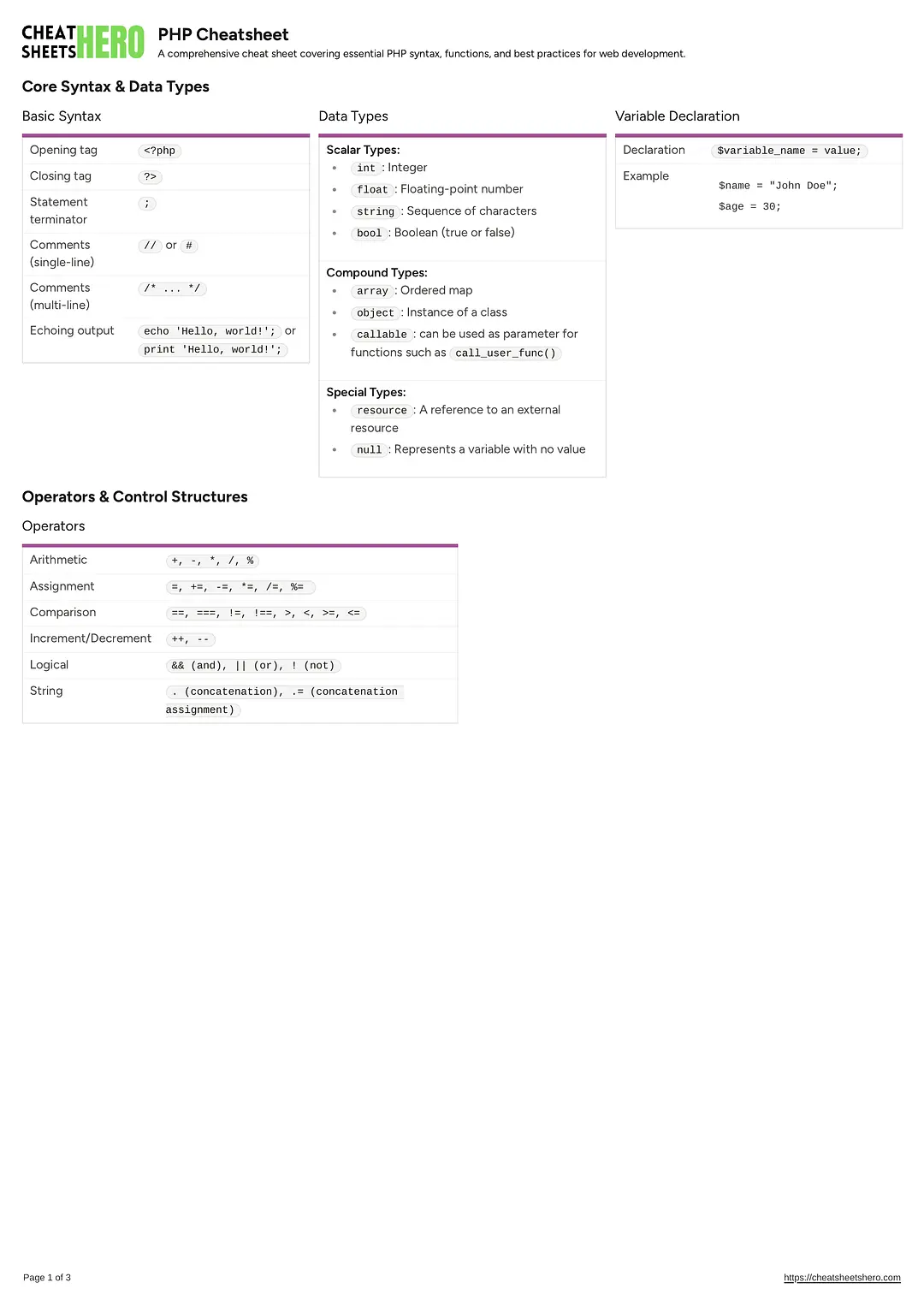 A comprehensive cheat sheet covering essential PHP syntax, functions, and best practices for web development.