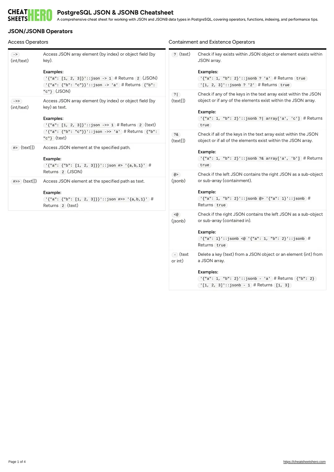 A comprehensive cheat sheet for working with JSON and JSONB data types in PostgreSQL, covering operators, functions, indexing, and performance tips.