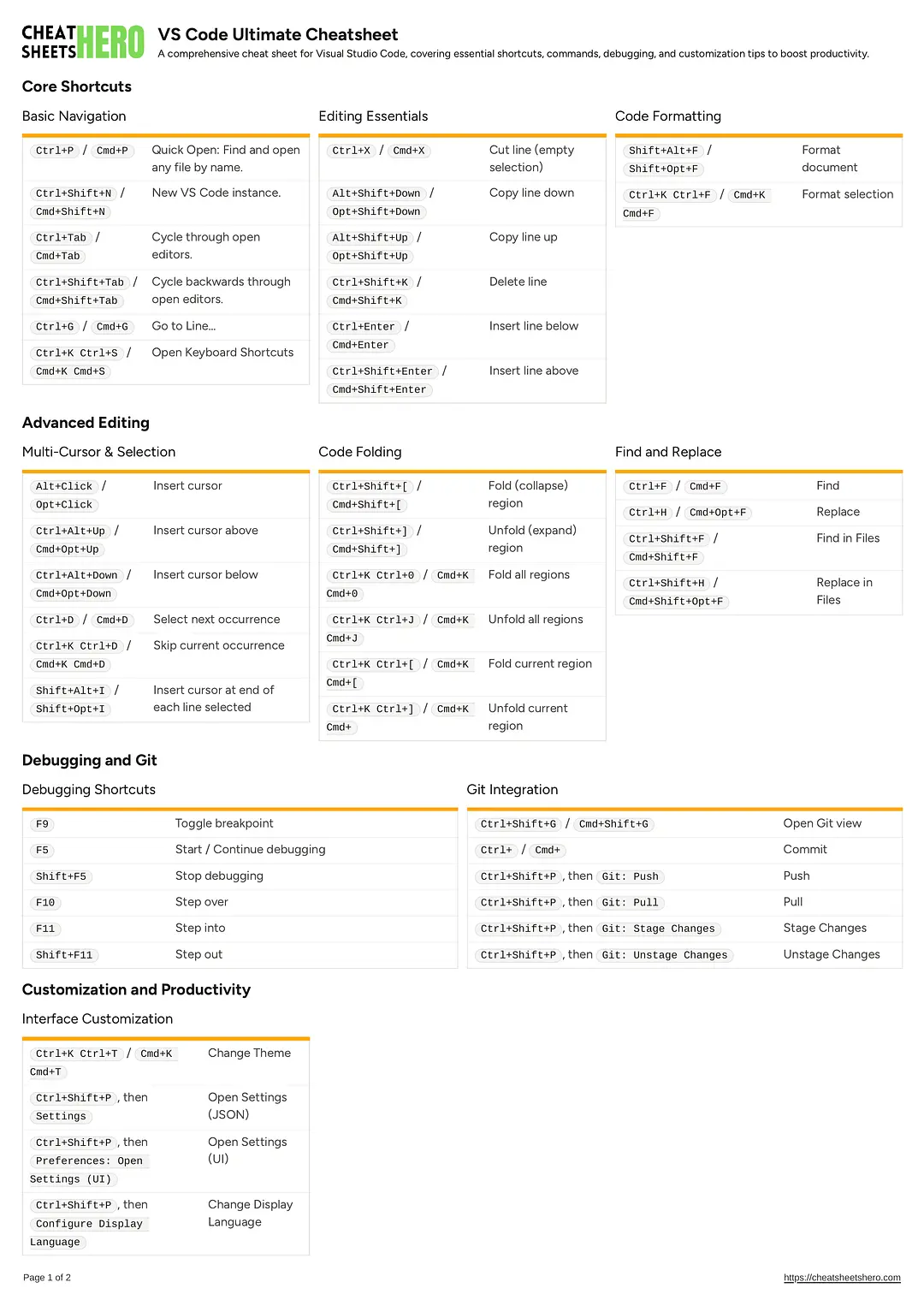 A comprehensive cheat sheet for Visual Studio Code, covering essential shortcuts, commands, debugging, and customization tips to boost productivity.