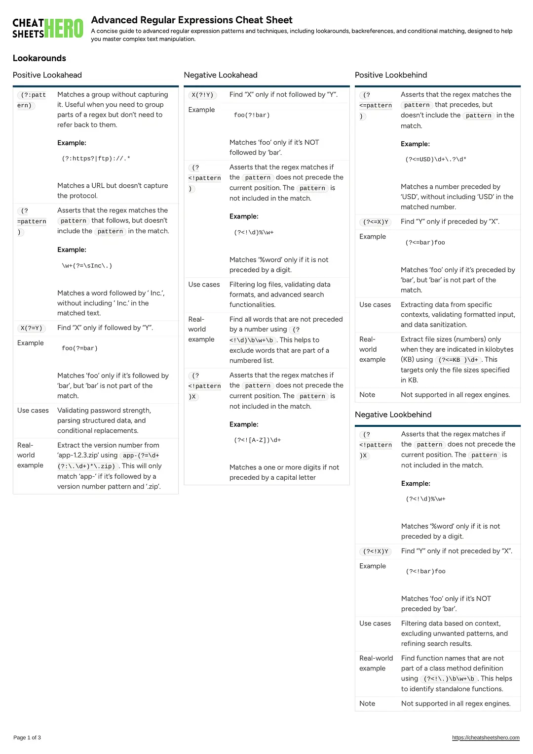 A concise guide to advanced regular expression patterns and techniques, including lookarounds, backreferences, and conditional matching, designed to help you master complex text manipulation.