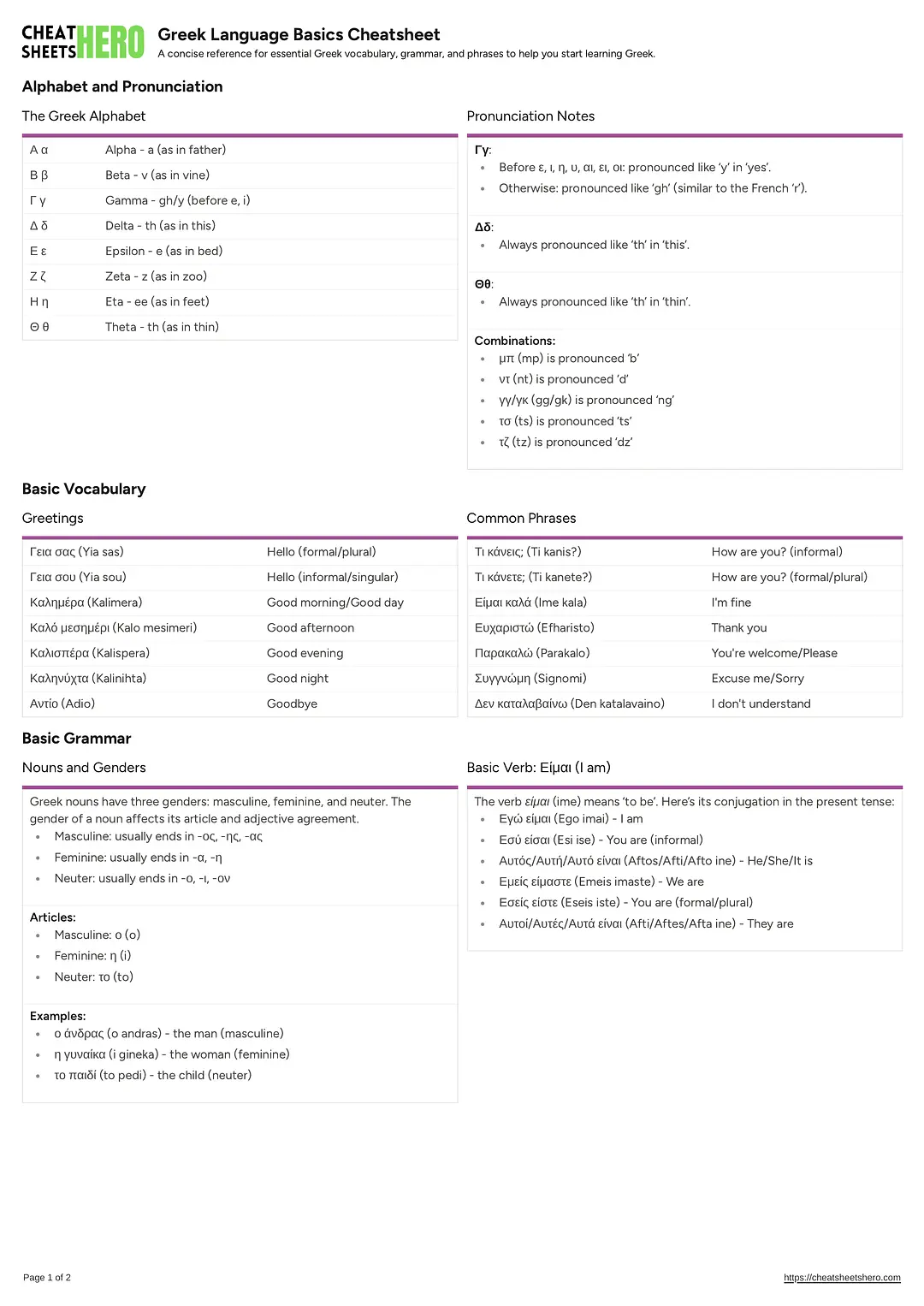 A concise reference for essential Greek vocabulary, grammar, and phrases to help you start learning Greek.